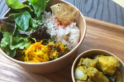 島野菜をふんだんに使ったカレー、スパイスが香るお惣菜、サラダなど。週替わりでメニューが変わります。