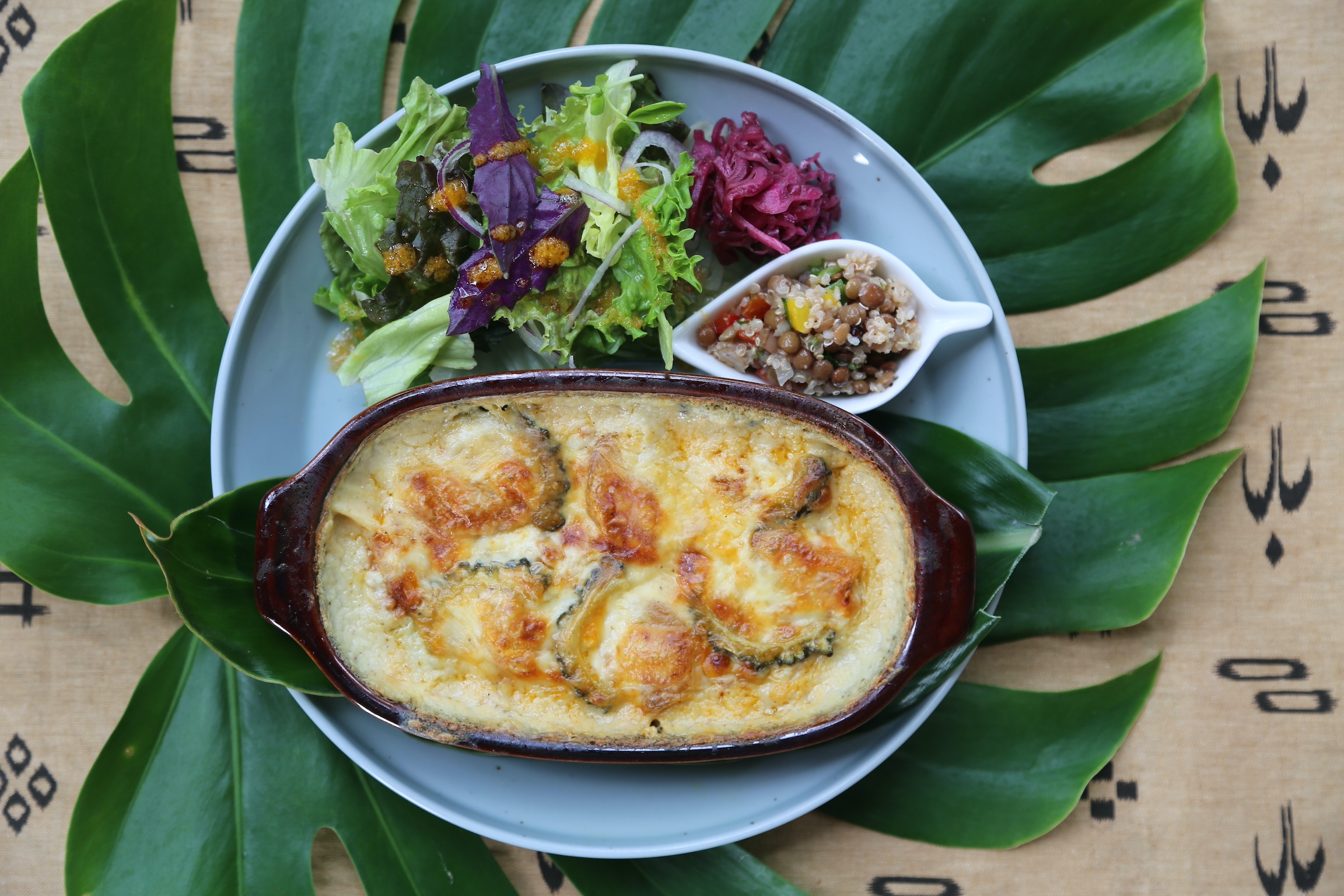 ベジミートもベシャメルソースも、全て自家製。紅芋やゴーヤなど、島野菜をゴロッと使ったカラダもこころ喜ぶ満足の一品です。