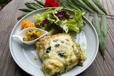 敷地内で育ったモリンガ、長命草、バジルを使用した完全無農薬の自家製ジェノベーゼとベシャメルソース&島野菜一層一層丁寧に重ね、クリーミーさと爽やかさも味わえるウェルネスな一品。
