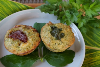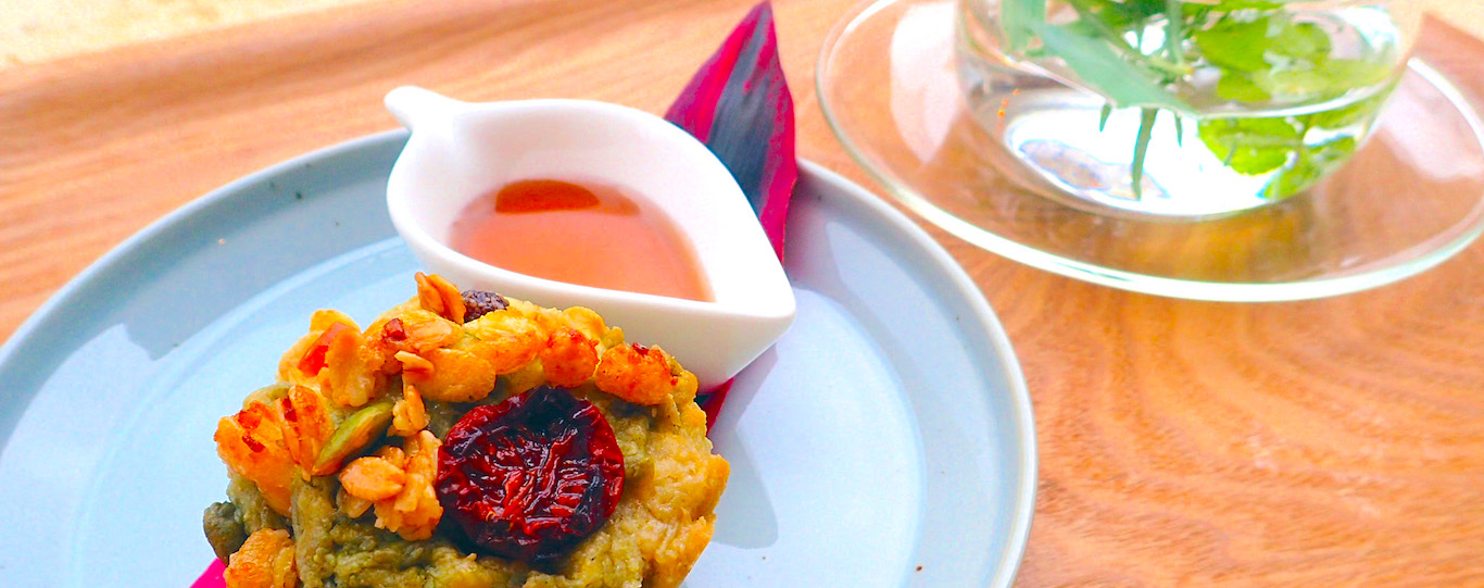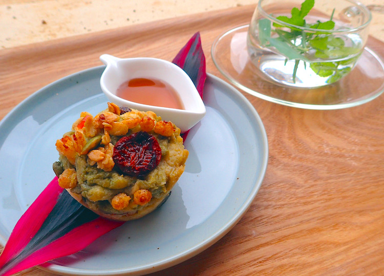 敷地内で育ったフーチバー(島ヨモギ)を摘み取るところから作ります。フーチバーの香りと優しい甘味のマフィン生地に、紅芋&クリームチーズと、石垣島パイナップルあんの2種をしのばせた自慢のベジタリアンスイーツです。テイクアウトは610円(シロップやナッツ、ドライフーチバーはつきません)