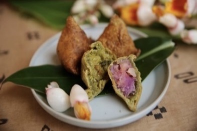 紅芋とパイナップルを使用したスイーツ系サモサと、田芋とゴーヤを使ったスパイス系サモサの2種。