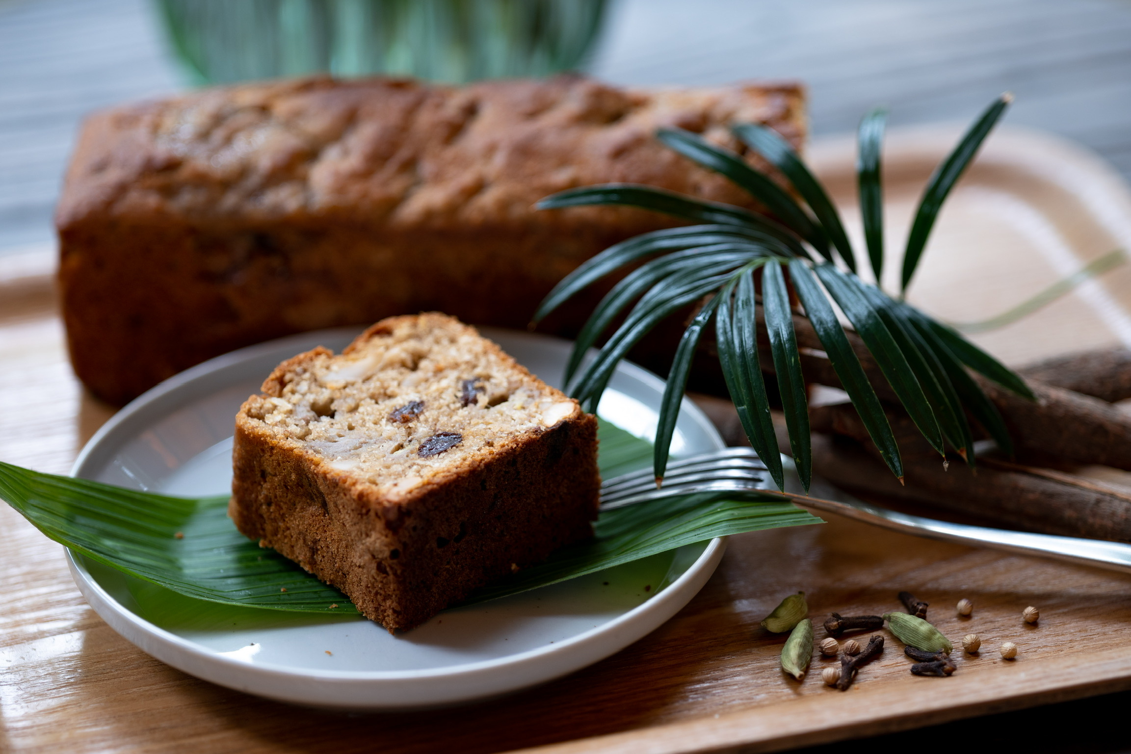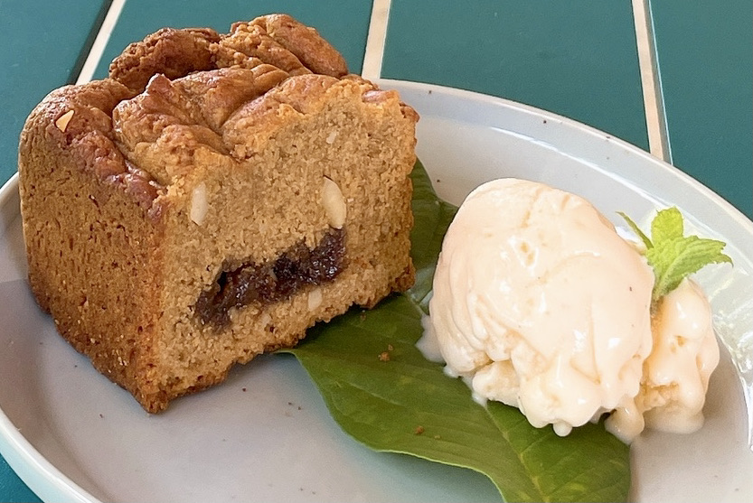 スパイスが得意なぬちぐさカフェが、ここでしか味わえないスイーツをお作りしました。爽やかなカルダモンの香りとコリアンダーの風味などのスパイス、さらにゴロっと入ったバナナの甘みが絶妙な一品です。スイーツにも軽食にもおすすめ。スパイシー&スイーツな特別なケーキです。テイクアウトは610円(アイスクリームはつきません)