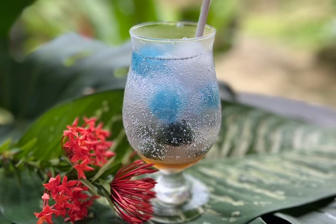 石垣島の太陽をたくさん浴びて無農薬で育ったバタフライピーを作った氷、石垣島産のシークワーサーの果実を丸ごと入れた、暑い季節にピッタリなレモンソーダです。シークワーサーをギュッとつぶすと爽やかな酸味が加わり、氷が溶けてくると鮮やかな色に変化します。グラスの中で味と見た目の変化を楽しめる1杯です。