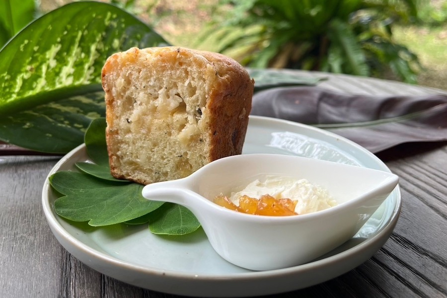 敷地内で育ったフーチバー(島ヨモギ)を摘み取るところから作ります。フーチバーの香りと優しい甘味のマフィン生地に、紅芋&クリームチーズと、石垣島パイナップルあんの2種をしのばせた自慢のベジタリアンスイーツです。テイクアウトは610円(シロップやナッツ、ドライフーチバーはつきません)