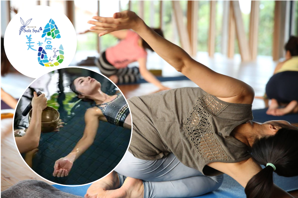 開放感あふれるスタジオでのヨガで身体を動かし、ヨガクラス後にはSALT SPA美塩にてシンギングボウル、ソルトスパを組み合わせたミネラルシンギングボウルテラピーを体験いただきます。