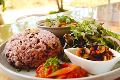 敷地内に併設されたベジタリアンカフェでは、季節の島の野菜や、フルーツを使った身体と心に優しい食事が楽しめます。