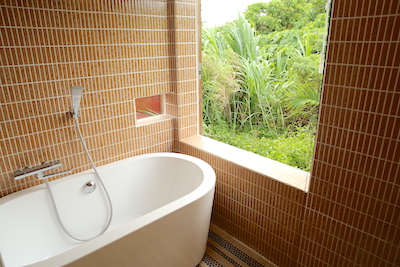 広いバスルームでゆったりとした時間を。屋外にはジャグジーもあり、自然のエネルギーを存分に浴びながら心身を癒すバスタイムも好評です。